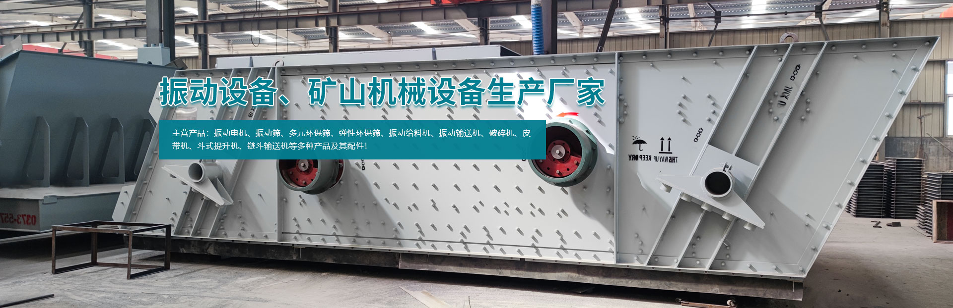 • 主要產品有系列振動電機、振動篩、多元環(huán)保篩、彈性環(huán)保篩、振動給料機、振動輸送機、破碎機、皮帶機、斗式提升機、鏈斗輸送機等多種產品